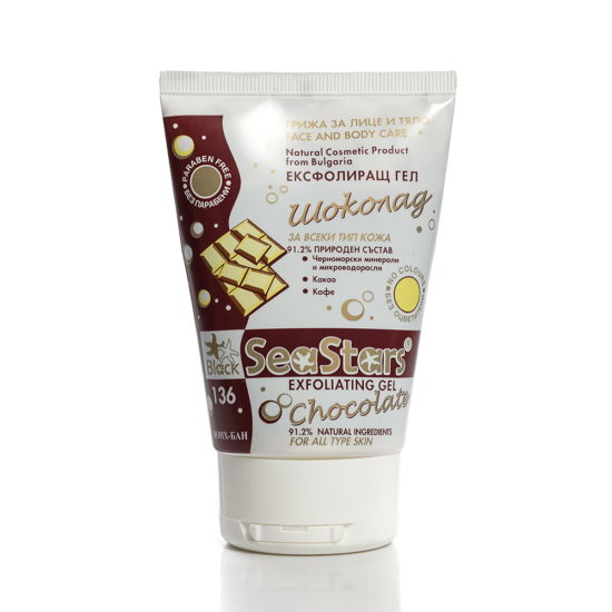 Το δροσιστικό τζελ προσώπου και σώματος απολέπισης με σοκολάτα της Black Sea Stars αφαιρεί απαλά τα νεκρά κύτταρα του δέρματος και καθαρίζει το δέρμα. Ο συνδυασμός σταθεροποιημένης αλύσου Black Sea lye, κακάου και καφέ ορυκτά και αναζωογονεί το δέρμα, ενώ το προστιθέμενο υαλουρονικό οξύ καταπολεμά αποτελεσματικά το χαλάρωμα. Το δέρμα είναι πιο σφριγηλό, πιο ελαστικό και αναζωογονημένο.