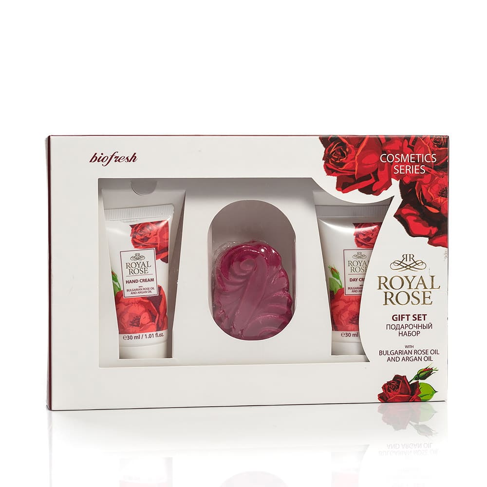 Το γυναικείο μίνι δώρο από τη σειρά καλλυντικών Royal Rose της Biofresh περιλαμβάνει τρία προϊόντα: μια κρέμα ημέρας, ένα σαπούνι με τριαντάφυλλο και μια κρέμα χεριών. Τα προϊόντα είναι εμπλουτισμένα με argan και rose oil, το οποίο θρέφει, μαλακώνει και ενυδατώνει το δέρμα του προσώπου και του σώματος. Το σετ είναι ένα υπέροχο συμβολικό δώρο. Διατίθεται σε μια βολική συσκευασία ταξιδιού.